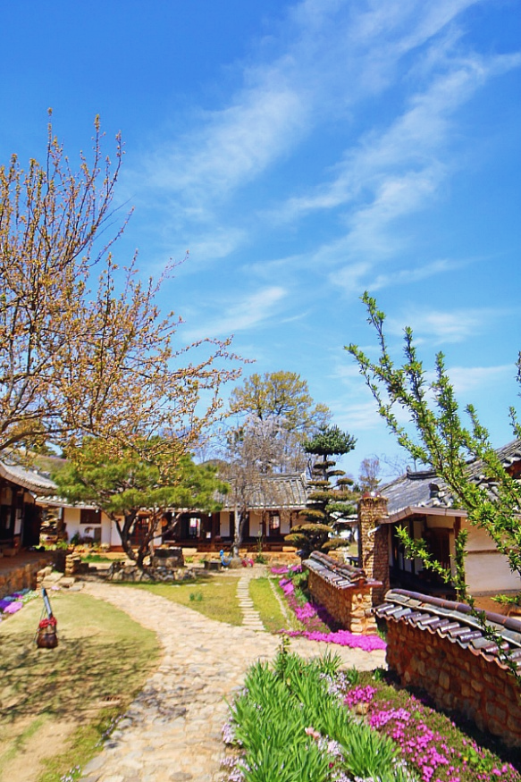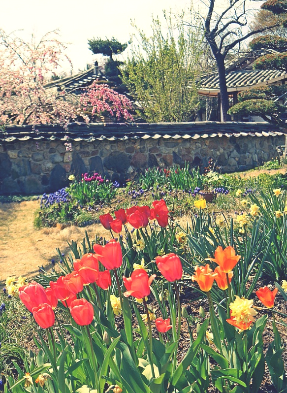 수선화와 포도히야신스. 튤립이 기와담장 어래로 가지런히 피어있다. 여 왕궁이라는 표현이 전혀 낯설게 않게 느껴지게 한다.