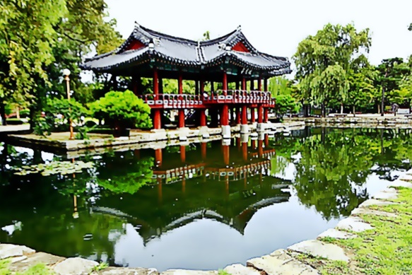 연못에 비친 누각과 능수버들의 반영이 한참을 바라보게 한다.