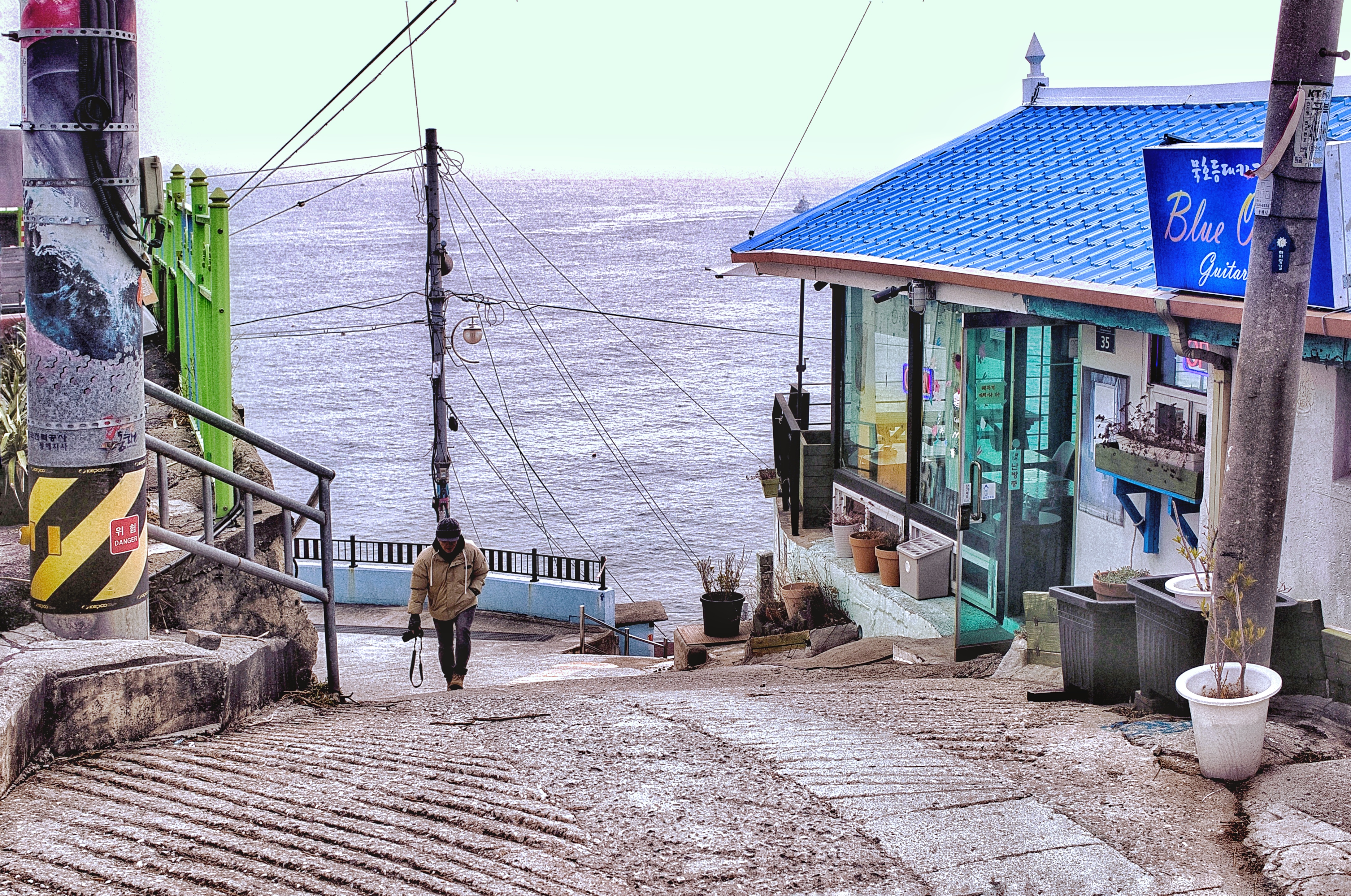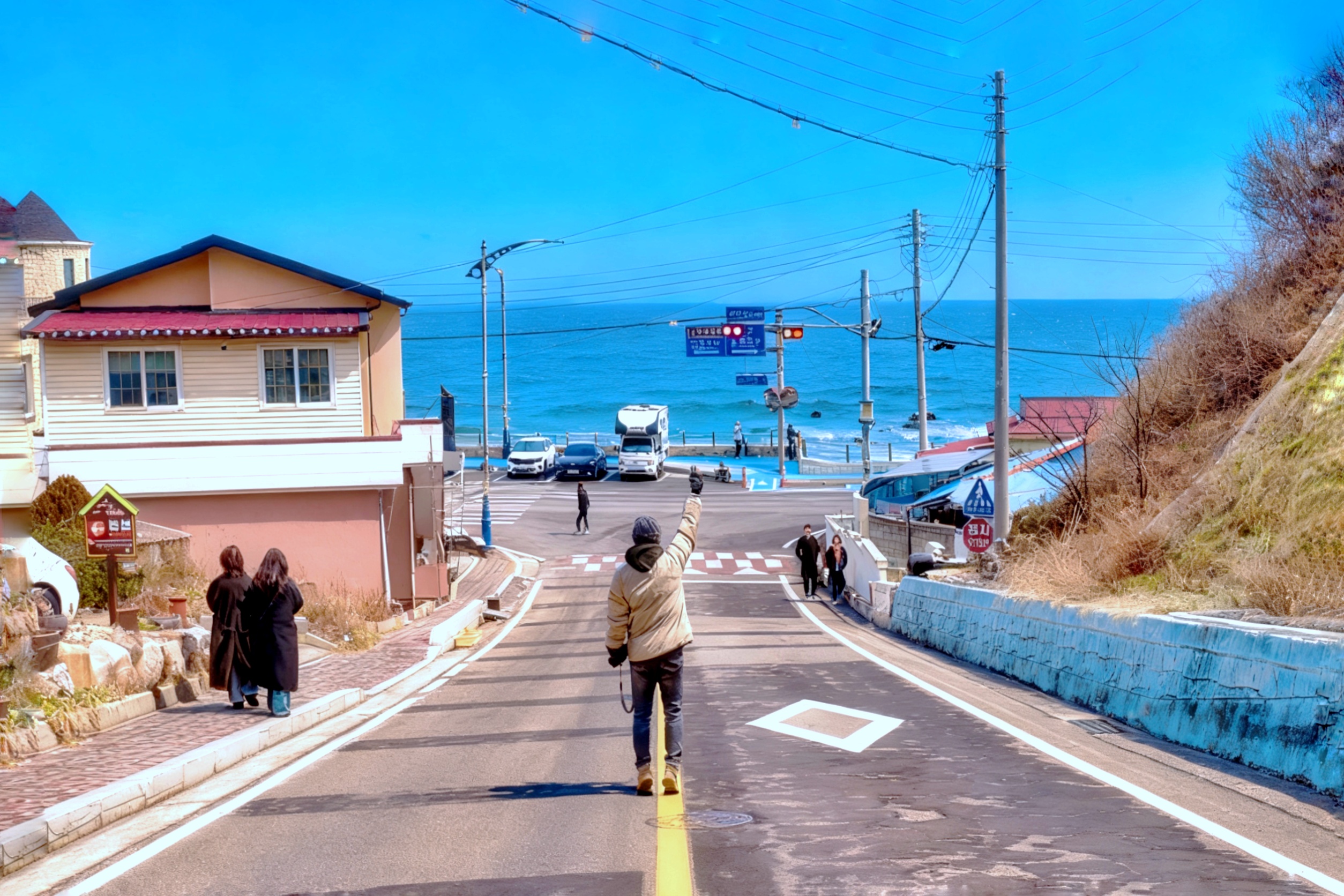 높은 곳에서 멀리 묵호항과 아달해변, 해랑전망대, 동해바다의 전경이 한눈에 들어오고 알록달록한 지붕들과 전망 좋은 카페